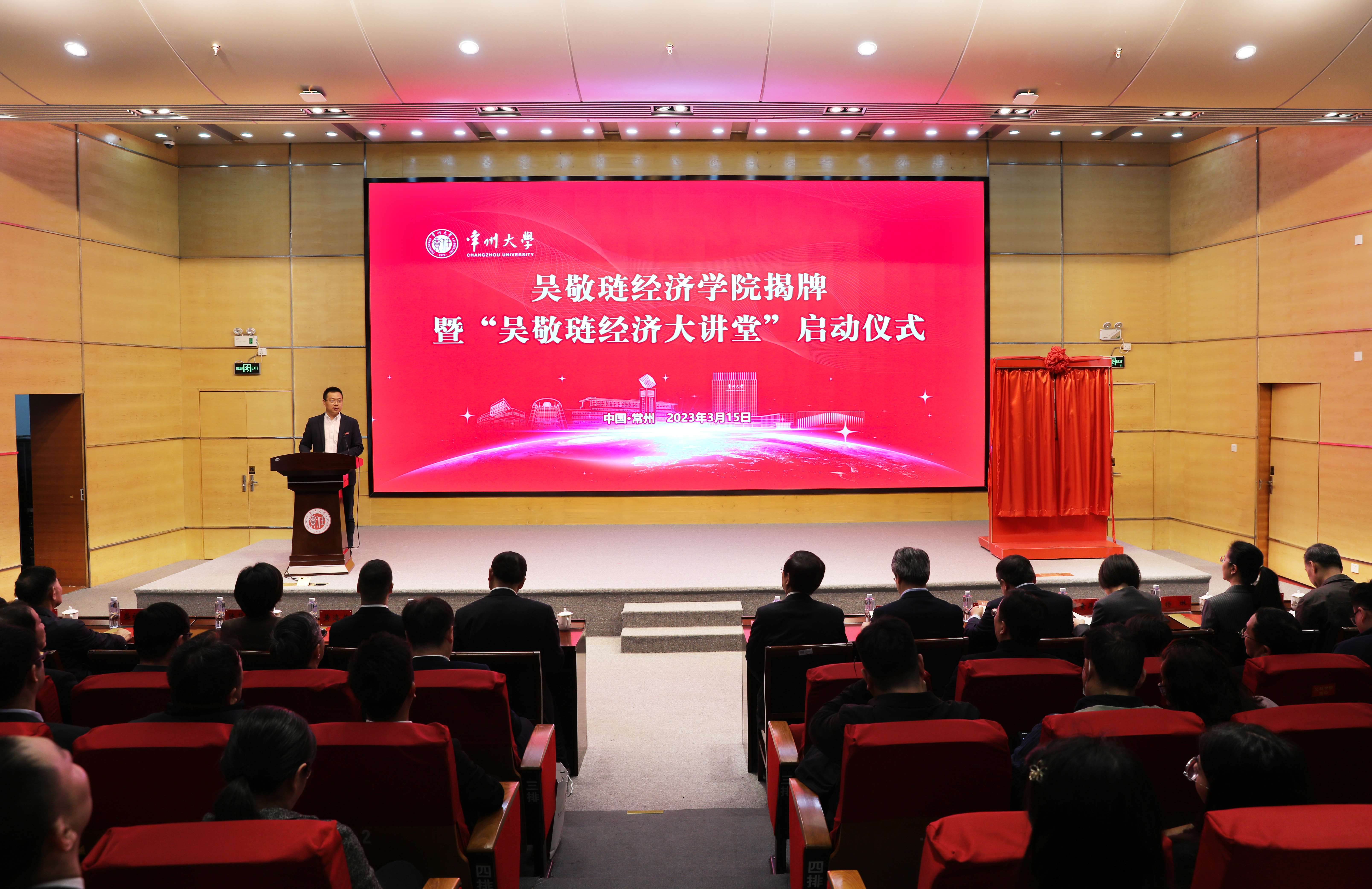 3月15日上午,常州大學吳敬璉經(jīng)濟學院揭牌暨“吳敬璉經(jīng)濟大講堂”啟動儀式在科教城校區(qū)文彰樓報告廳舉行。國家發(fā)改委宏觀經(jīng)濟研究院原副院長、中國人民大學發(fā)展與改革研究院常務副院長馬曉河,第七大道執(zhí)行董事兼CFO、無錫市上市公司協(xié)會副秘書長李正全,孫冶方基金會理事長顧問葛俊,中信出版集團《比較》雜志副主編吳素萍,常州市人大常委會委員、財政經(jīng)濟委員會副主任委員李亞雄,常州市政府研究室原主任盛祖祥,常州市現(xiàn)代企業(yè)發(fā)展研究會會長周俊,常州市現(xiàn)代企業(yè)發(fā)展研究會常務副會長、派德科技董事長盧文曉,常州匯塑勤業(yè)進出口有限公司總經(jīng)理陳祥應邀出席。我校黨委書記陳群,黨委副書記、校長徐守坤,黨委常委、副校長黃海燕,黨委常委、總會計師陸華良,黨委常委、宣傳部部長楊琳出席活動。學校相關職能部門負責人、文科學院負責人和教師、學生代表參加活動。陸華良主持活動。