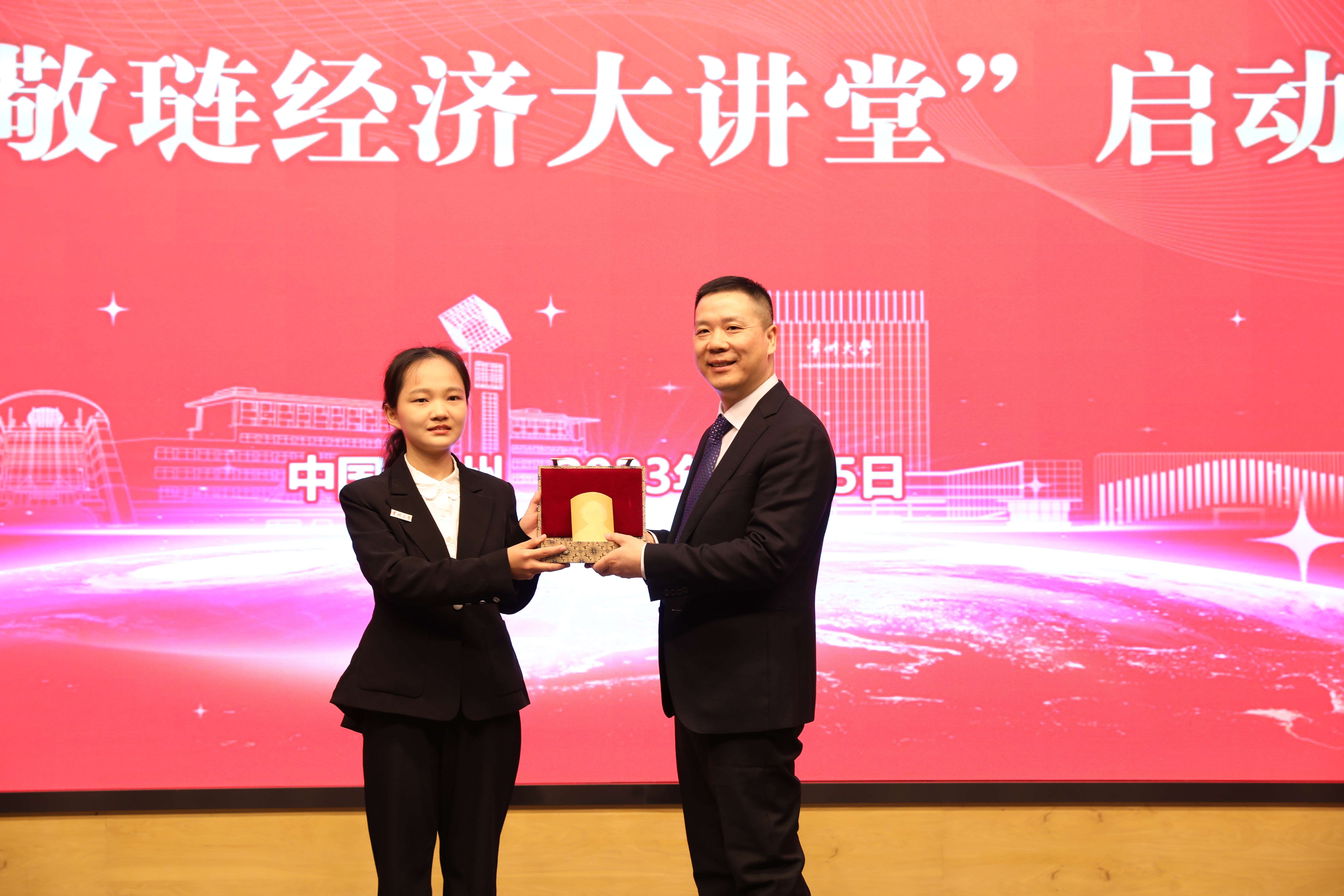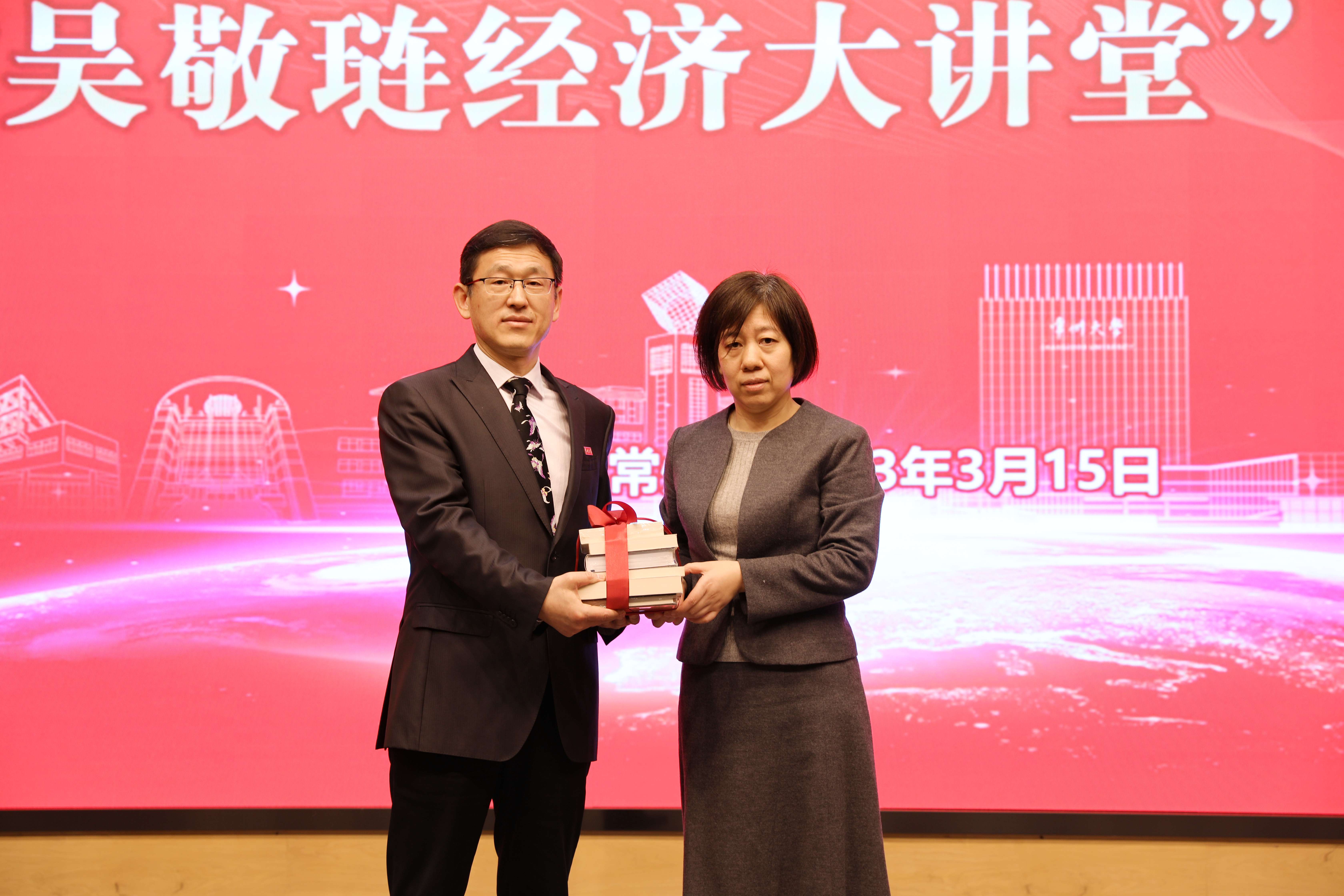黃海燕宣讀學院更名文件。馬曉河、李正全、陳群、徐守坤共同為吳敬璉經(jīng)濟學院揭牌。吳敬璉教授受聘為學院名譽院長,馬曉河、李正全、吳素萍受聘為學院客座教授。李正全代表吳敬璉教授接受學生代表敬贈留青竹刻。吳素萍代表吳敬璉教授向學院捐贈圖書。